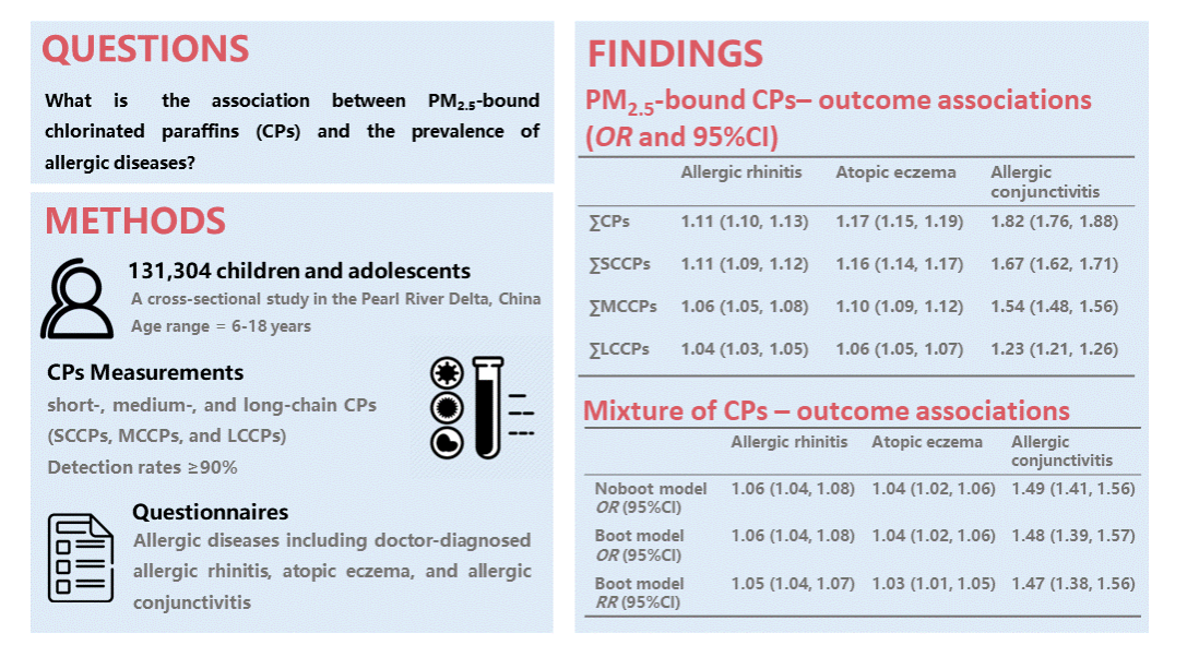 氯化石蠟(Chlorinated paraffins,CPs)是多氯代正鏈烷烴混合物,根據碳鏈長度可以分為短鏈、中鏈和長鏈氯化石蠟。課題組前期綜述表明目前氯化石蠟對于健康的不良影響引起廣泛關注,但基于人群的流行病學研究證據匱乏(Science of The Total Environment,DOI:10.1016/j.scitotenv.2023.163953)。免疫系統具有識別和清除外來物質(包括環境污染物)的功能,環境污染物被吸收入體內后可引發免疫反應,進而可能導致免疫系統疾病。過敏性疾病是一組常見的、由免疫系統超敏反應引發的疾病,在全球兒童青少年群體具有較高的患病率。目前研究提示,氯化石蠟可能造成免疫系統功能紊亂,但尚無流行病學證據支持外環境中氯化石蠟暴露與免疫系統疾病之間存在關聯。團隊在珠三角地區的中小學開展過敏性疾病的大人群橫斷面調查,同期對冬夏兩季的大氣顆粒物進行采樣監測,并檢測PM2.5上附著的氯化石蠟水平。檢測結果顯示,相比其他國家地區,珠三角地區PM2.5中氯化石蠟濃度處于較高水平(Environment International,DOI:10.1016/j.envint.2023.107932)。在此基礎上,應用混合效應模型和quantile-based g-computation方法,分析珠三角地區131304名6-18歲兒童青少年中PM2.5氯化石蠟水平與過敏性疾病(鼻炎、濕疹、結膜炎)患病風險的關聯,發現氯化石蠟暴露與兒童青少年過敏性疾病患病風險增加呈正相關,且關聯在超重肥胖兒童中更為顯著。本研究為氯化石蠟的健康風險評估提供一定的流行病學數據。