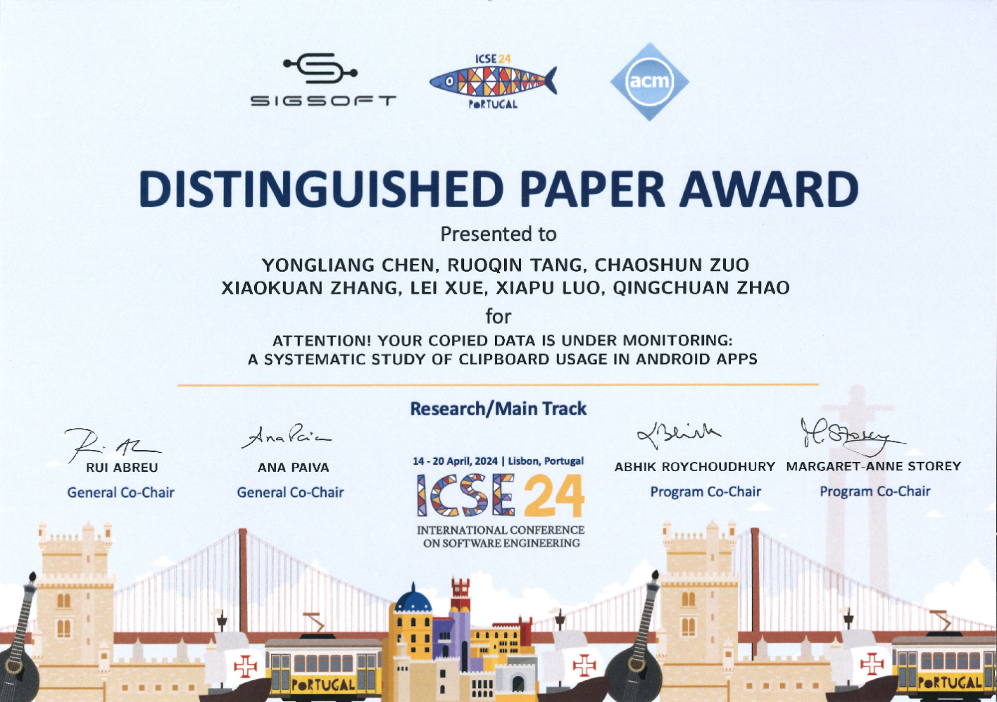 中大新聞網(wǎng)訊(通訊員林綠)近日,軟件工程大會ICSE 2024在葡萄牙里斯本召開。中山大學(xué)網(wǎng)絡(luò)空間安全學(xué)院副教授薛磊與香港城市大學(xué)、香港理工大學(xué)等單位學(xué)者合作發(fā)表的關(guān)于安卓應(yīng)用安全的論文“Attention! Your Copied Data is Under Monitoring: A Systematic Study of Clipboard Usage in Android Apps”榮獲ACM SigSoft杰出論文獎。