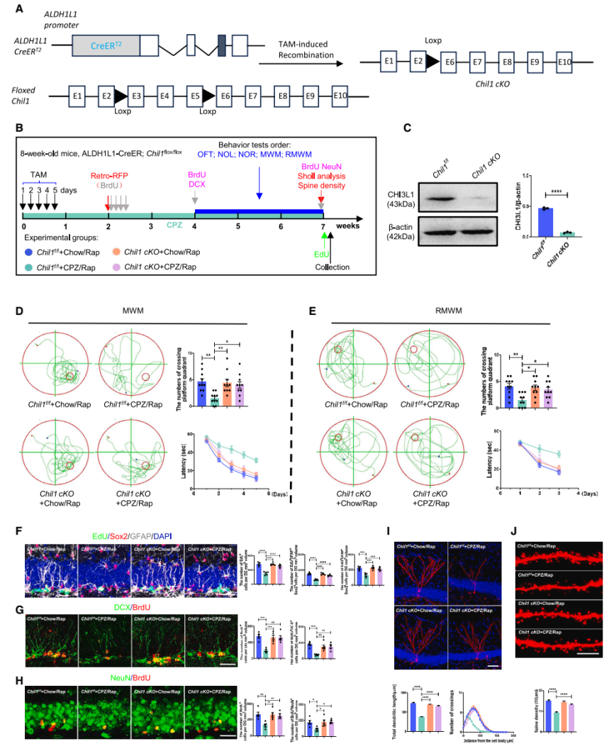 星形膠質(zhì)細(xì)胞內(nèi)特異性敲除Chil1可改善脫髓鞘海馬的神經(jīng)發(fā)生缺陷及認(rèn)知功能障礙。團(tuán)隊(duì)?wèi)?yīng)用ALDH1L1-CreERT2;Chilflox/flox(Chil cKO)小鼠,發(fā)現(xiàn)Chil cKO逆轉(zhuǎn)了CPZ/Rap處理對NSCs增殖分化、新生神經(jīng)元發(fā)育和認(rèn)知功能造成的損害作用(圖3)。