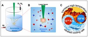 閆波博士后與李胤午副研究員和曹瑋瑋博士合作應用LBL技術發展了從氨水中超快速高效提取氫氣的新方法(圖3)。他們選取水是作為氨的液相介質進行LBL制氫,選取水介質過程避免了氨氣的壓縮和冷卻液化程序。他們利用LBL方法實現了高達33.7 mmol/h的氫氣產率。他們進行了第一性原理模擬計算,得出了激光誘導氨分解的可能反應路徑和反應熱力學條件。未來的研究可以進一步探索LBL方法在其他化學反應中的應用(JACS 146(2024)4864,閆波、李胤午、曹瑋瑋為共同第一作者,楊國偉為通訊作者)。
