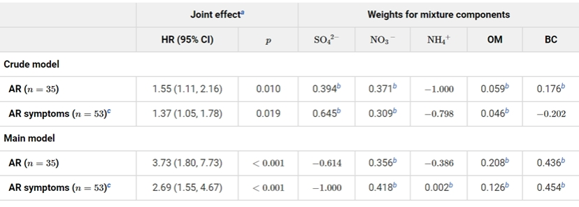該研究追蹤調查來自廣州越秀出生隊列的657名母子對,通過病歷診斷和標準化問卷調查收集了幼兒出生至2歲的過敏性鼻炎發生情況。基于2016-2019年期間中國大氣成分近實時追蹤數據集(Tracking Air Pollution in China,簡稱TAP)的日均污染物數據,評估了母親從懷孕至分娩期間的PM2.5及其化學成分的平均暴露濃度,包括硫酸鹽(SO42-),硝酸鹽(NO3-),銨鹽(NH4+),黑碳(BC)和有機物(OM)。采用quantile-based g-computation 模型對PM2.5組分的混合暴露進行聯合作用分析,并以權重指數表示各組分的作用方向與相對貢獻。研究結果發現PM2.5每升高5 μg/m3與幼兒2歲以內鼻炎及其癥狀風險分別升高1.85和1.79倍有關;PM2.5的5種組分共同升高一個五分位數水平與鼻炎及其癥狀風險升高3.73和2.69倍有關。其中,黑碳在單污染物模型和多組分聯合暴露中均與幼兒鼻炎結局呈現正相關,是組分聯合有害效應的最大貢獻者(分別為43.6%和45.4%,見表1)。
