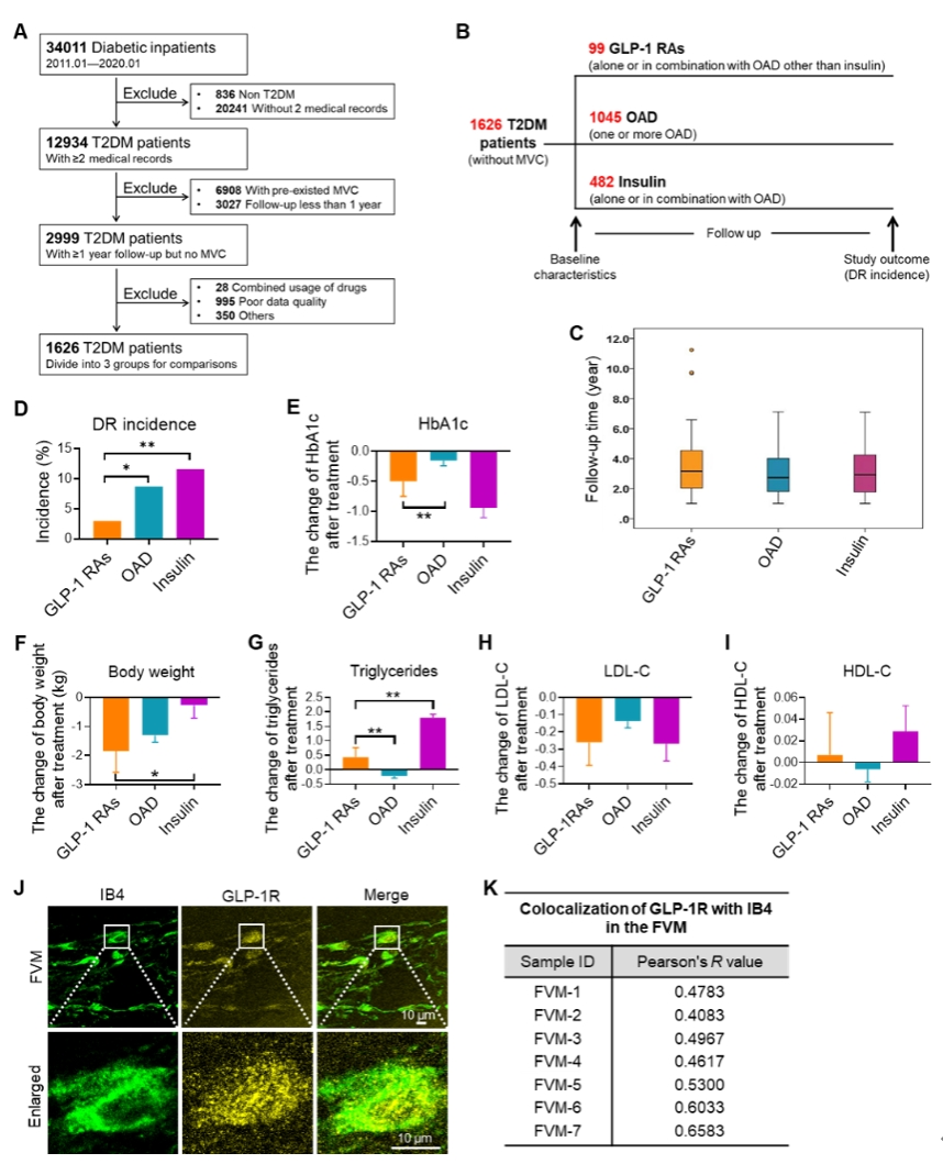 通過對2011年至2020年在附屬第三醫院住院的34011例2型糖尿病患者進行回顧性分析發現,相較于使用其他口服降糖藥或聯合使用胰島素,使用GLP-1 RAs能顯著降低DR發生率,為DR早期防治提供新的臨床證據。