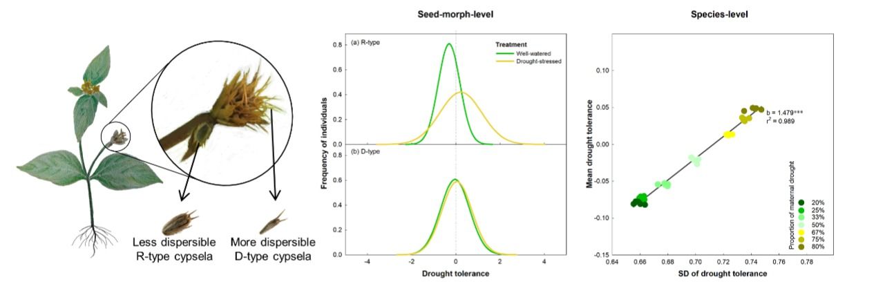 彭少麟團(tuán)隊(duì)從水分脅迫出發(fā),以全球廣布的菊科種子二型性植物金腰箭為研究對(duì)象,構(gòu)建兩年三代水分處理實(shí)驗(yàn),詳細(xì)測(cè)定每株植物干旱脅迫與對(duì)照處理下產(chǎn)生的后代數(shù)量和耐旱性,首次報(bào)道了親本干旱誘導(dǎo)子代種內(nèi)耐旱性變異變化與子代傳播能力的相關(guān)性(圖1)。結(jié)果表明,經(jīng)歷干旱脅迫后,親本顯著提高了傳播能力較弱子代的耐旱性均值或變異,這種變化能夠在種群水平上得到體現(xiàn),從而增強(qiáng)整個(gè)種群應(yīng)對(duì)水分環(huán)境不確定性的適應(yīng)能力(圖2)。脅迫耐受力變異和種子傳播能力存在較強(qiáng)交互作用,這可能是促進(jìn)種子二型性物種廣泛分布的潛在適應(yīng)性進(jìn)化路徑,強(qiáng)調(diào)了種子二型性和脅迫耐受力變異對(duì)植物在多變環(huán)境下避免繁殖失敗風(fēng)險(xiǎn)的重要生態(tài)意義。