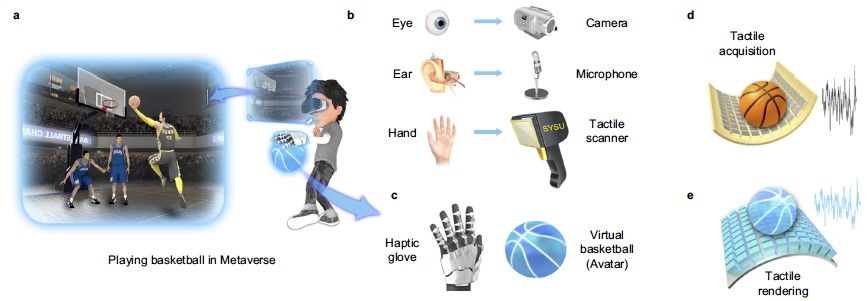 圖1元宇宙中的“打籃球”游戲、觸覺手套和基于觸覺掃描儀的觸覺信息采集和觸覺渲染