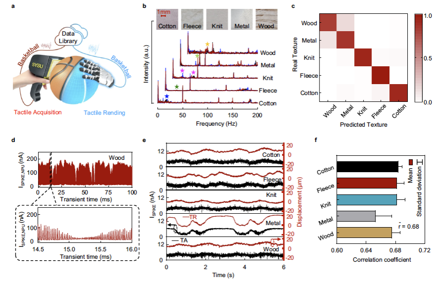 課題組利用制備的10×10神經形態觸覺傳感器陣列捕捉5種不同類型材質表面紋理的神經形態觸覺信息(TA),見圖3。不同類型材質的TA信號頻譜存在不同的特征峰,其采用人工神經網絡(ANN)計算的識別率高達93%,表明神經形態觸覺傳感器陣列可采集高質量材質表面特征信息。將這些觸覺信息編碼產生驅動執行器表面的觸覺渲染信息(TR),嘗試再現皮膚在虛擬空間重現材質表面“真實”的觸覺。該傳感器陣列采集的神經形態觸覺信號(TA)與重現的觸覺渲染信號(TR)相關性高達0.68;而在進一步的物理感知心理學實驗中,超過75%的志愿者表示能夠通過重現的觸覺渲染信息可以感知物體表面的粗糙度,初步證明該觸覺傳感器具備實現觸覺的采集-重現閉環功能的潛力。所提出的神經形態觸覺傳感器,憑借其低成本、低功耗、易于集成和制備等特點,為實現大規模人工觸覺感知系統奠定了堅實的理論和實驗基礎。