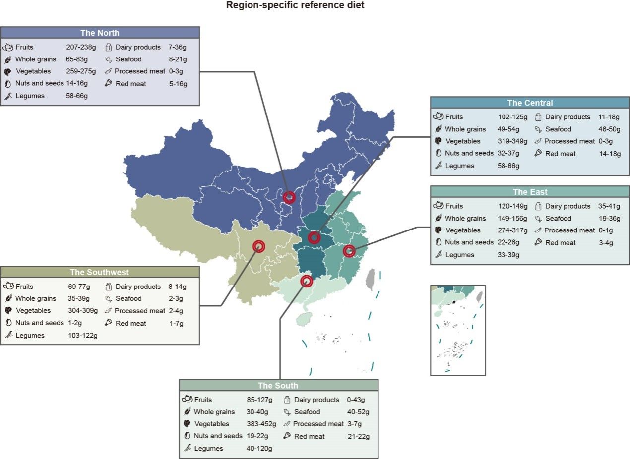 然而,目前世界上大部分國家和地區的食源性膳食指南并未納入膳食對環境影響的考量。2019年《柳葉刀》率先提出并制定的“星球健康飲食模式(EAT-Lancet Planetary Health Diet)”是目前唯一一個可量化的可持續健康膳食模式。然而,目前星球健康飲食模式相關研究大多停留在理論層面,缺少基于真實世界的數據研究。此外,星球健康飲食的建立主要基于西方人群飲食習慣和膳食模式,并未兼顧到不同國家和地區的資源特征、飲食習慣、經濟水平等因素。強行引入不符合本土飲食習慣的膳食模式,不僅無法有效改善環境,還可能進一步加劇膳食相關疾病風險。近日,公共衛生學院柳雁和夏敏課題組在國際食品頂級期刊Nature Food雜志(中科院1區TOP,IF=23.6)發表了題為“Adoption of Region-specific Diets in China Can Help Achieve Gains in Health and Environmental Sustainability”的研究論文。該研究基于中國不同地區的飲食習慣、環境資源特征以及經濟發展水平,建立了本土化的可持續健康膳食方案——區域特異性膳食模式(Region-Specific Reference Diet,RRD),精準指導各地居民可持續飲食,為實現“健康中國”和可持續發展目標提供了切實可行的方案。