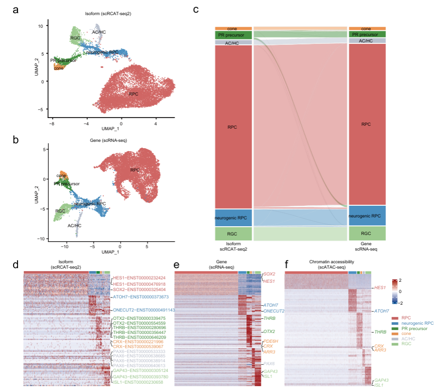 研究者將scRICA-seq應用于人類視網膜發育過程,構建了人類視網膜類器官的單細胞多組學圖譜。基于單細胞異構體的聚類分析,確定了六個細胞簇,對應于六種典型的視網膜早期神經元,包括視網膜祖細胞(RPCs)、視網膜神經節細胞(RGCs)、無長突細胞/水平細胞(AC/HCs)、視錐細胞前體(PR precursors)、神經生成RPCs(neurogenic RPCs)以及視錐細胞(cones),其結果與scRNA-seq技術所得數據高度一致。(圖3)