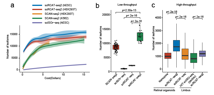 研究者將scRCAT-seq2在低通量與高通量條件下與多種三代測序技術(如SCAN-seq2、scISOr-seq、HIT-scISO-seq等)進行對比分析,結果顯示scRCAT-seq2在成本效益和檢測靈敏度方面均具有顯著優勢。(圖2)