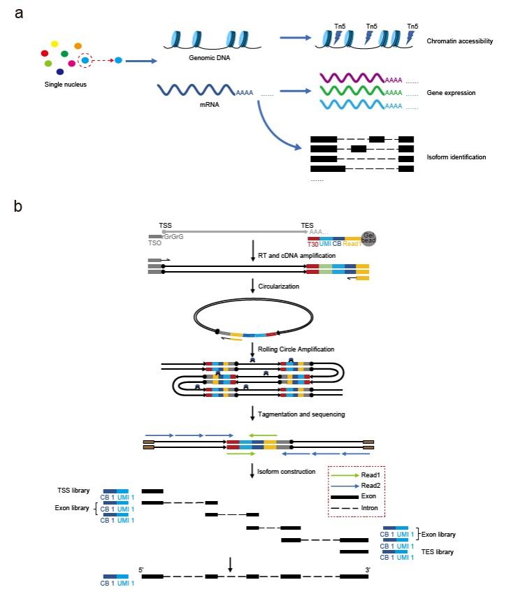 胡友金團隊長期專注于單細胞測序技術的創新開發。早在2020年,該團隊已在《Nature Communications》上發表scRCAT-seq技術,用于RNA isoform的檢測。此次,團隊進一步改進原有方法,發展了scRCAT-seq2全長轉錄組測序技術,并結合10x Genomics的Chromium Next GEM Single Cell Multiome ATAC + Gene Expression平臺,實現了染色質可及性與RNA isoform同時檢測的多組學方法。其中,scRCAT-seq2的核心技術是通過單分子成環技術處理cDNA,并將覆蓋TSS,TES和exon的測序序列進行同一標簽標記,并組裝構建全長cDNA序列。(圖1)