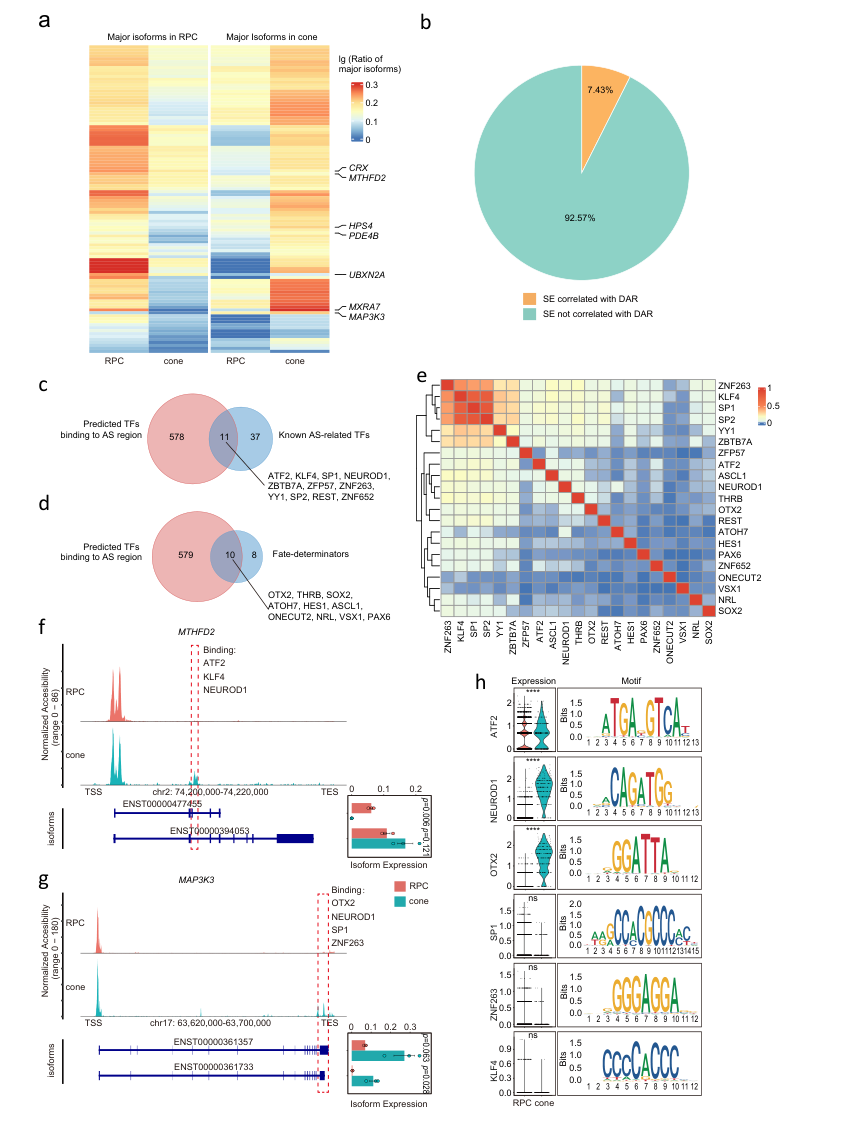 圖4:RPC發育過程中RNA isoform選擇與染色質可及性和TFs的相關性