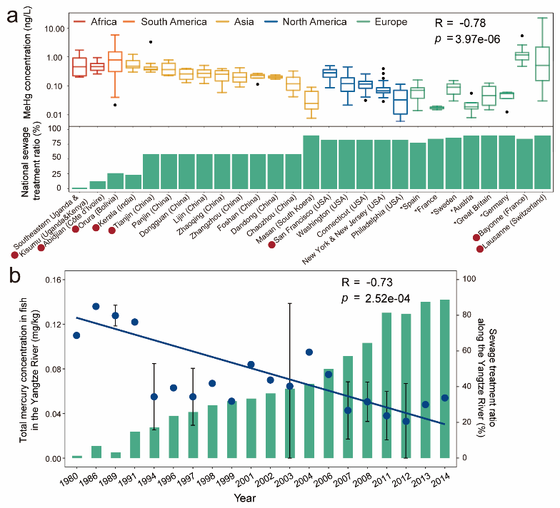 (a)全球城市水域的甲基汞水平與國家污水處理率呈顯著負相關;