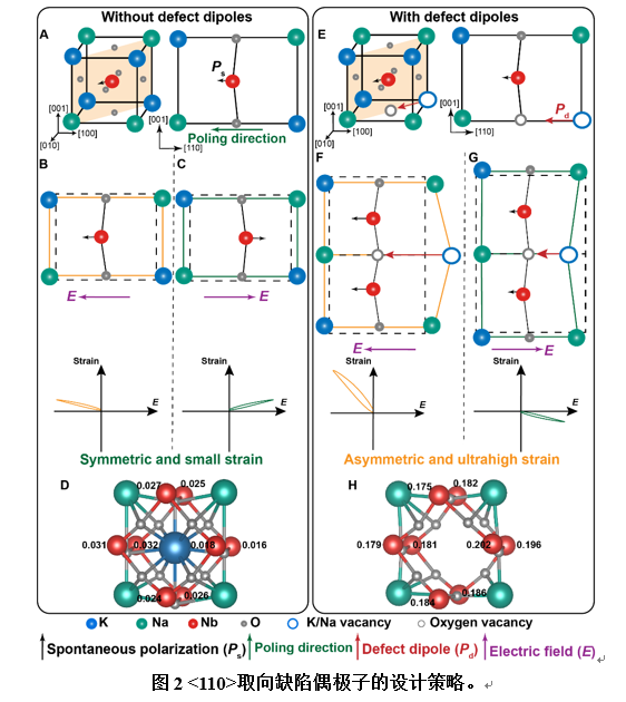 為增強(qiáng)缺陷偶極子與自發(fā)極化之間的相互作用,團(tuán)隊(duì)設(shè)計(jì)了<110>取向的缺陷偶極子。研究表明,由于<110>方向與正交相KNN陶瓷中的自發(fā)極化平行,該取向的缺陷偶極子與自發(fā)極化之間的相互作用力是傳統(tǒng)<001>取向的缺陷偶極子的3倍。這一設(shè)計(jì)不僅提高了壓電陶瓷的電致應(yīng)變,還發(fā)現(xiàn)缺陷偶極子引起的超高表觀應(yīng)變存在明顯的厚度效應(yīng),為理解缺陷偶極子在材料中的分布及其在電場(chǎng)下的響應(yīng)行為提供了新的啟示。