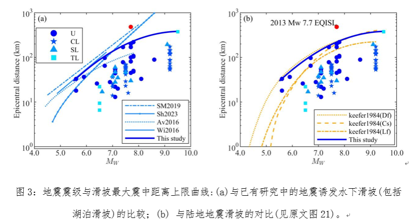 從地震引發的海底滑坡數據庫分析中得出的主要發現包括:1)85%的海底地震滑坡發生在距離岸線20 km以內(圖 2),這一特點導致海嘯預警和防范措施的時間非常有限;2)在70次觸發異常海嘯的地震中,約一半地震的震中位于陸地,且近40%為走滑事件,這些特征對海嘯預警系統提出了額外挑戰;3)地震引發的海底滑坡可以由非常微弱的地面震動觸發,包括最低PGA約為0.01g,最低MMI為3.6。從地震引發的海底滑坡與陸地滑坡的比較中得出的主要發現包括:地震引發的海底滑坡通常發生在坡度較緩的區域 (<20° vs. 0~85°);海底滑坡的體積通常比陸地滑坡大四個數量級;相同震級地震在海域可觸發更遠距離的滑坡(圖 3);此外,觸發海底滑坡的地震震級通常略低于觸發陸地滑坡的地震震級。盡管如此,海底滑坡與陸地滑坡在地震參數(如PGA和MMI)及震源機制方面表現出比預期更多的相似性。由于海底地震滑坡和陸地地震滑坡研究探討的是在統一框架下相互關聯的科學問題,本研究強調了對這兩類滑坡進行對比分析和驗證的重要性,以揭示地震觸發海底滑坡的復雜機制及其內在關系。