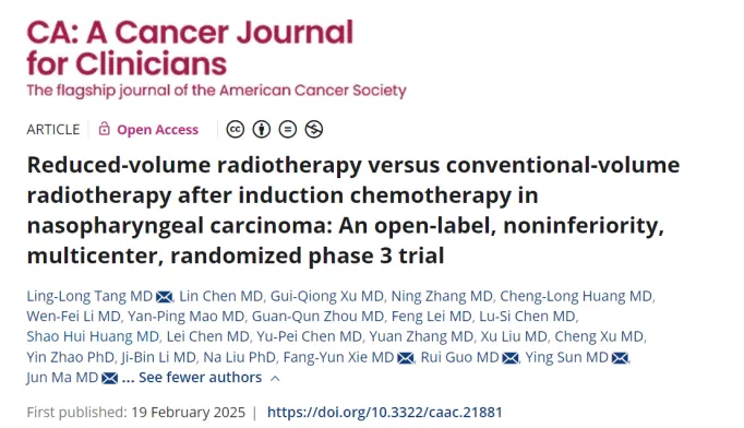 中大新聞網(wǎng)訊(通訊員趙現(xiàn)廷)2025年2月20日,中山大學(xué)腫瘤防治中心馬駿院士、孫穎教授、唐玲瓏教授團(tuán)隊(duì)在國(guó)際腫瘤學(xué)巔峰期刊《臨床醫(yī)師癌癥雜志》(CA:A Cancer Journal for Clinicians)(影響因子503.1)發(fā)表全球首篇臨床試驗(yàn)研究論著。這項(xiàng)突破性成果以“鼻咽癌誘導(dǎo)化療后縮小體積放療對(duì)比傳統(tǒng)放療”為題,開創(chuàng)了該雜志創(chuàng)刊的先河。