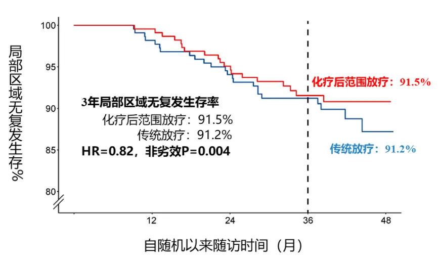 為此,馬駿院士團(tuán)隊(duì)展開有關(guān)研究,采用了國(guó)際通用的標(biāo)準(zhǔn)多中心、隨機(jī)、平行對(duì)照設(shè)計(jì),納入445例中晚期鼻咽癌患者,隨機(jī)分為兩組:分別基于化療后和化療前腫瘤范圍進(jìn)行放療。主要終點(diǎn)為3年局部區(qū)域無復(fù)發(fā)生存率,次要終點(diǎn)包括毒副反應(yīng)和生活質(zhì)量。