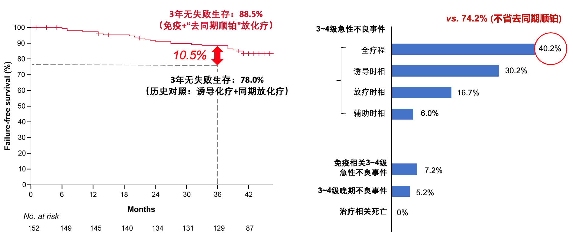 研究發現,采用上述方案可使患者的3年無失敗生存達到88.5%的高水平,相較于既往“誘導化療后同期放化療”的歷史參照值顯著提高了10.5%,還可使嚴重急性毒性發生率降低至40.2%,其中放療時相的嚴重急性毒性發生率僅為16.7%。
