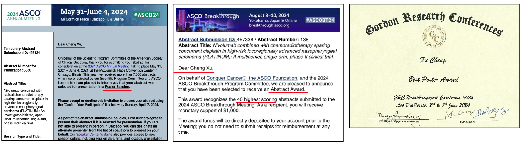 研究入選2024年美國臨床腫瘤學會(ASCO)大會壁報,并獲得ASCO Breakthrough峰會摘要獎(Abstract Award,全球僅40項)、國際鼻咽癌Gordan大會(GRC)最佳壁報獎(Best Poster Award),得到國際同行認可。針對上述新療法的一項多中心、隨機對照、3期試驗目前已完成,有望改寫鼻咽癌治療指南。