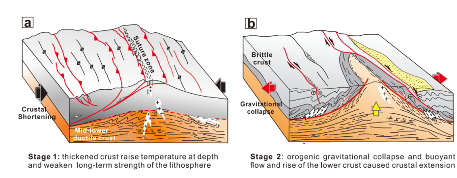 綜合地質與地球物理觀測,本研究提出斜向匯聚帶的地殼增厚過程使得深部地殼溫度升高,弱化了下地殼與上地幔的強度(尤其是在富水的條件下),并導致造山作用晚期的重力垮塌,驅動滇西北裂陷系發生顯著的構造轉換(圖六)。