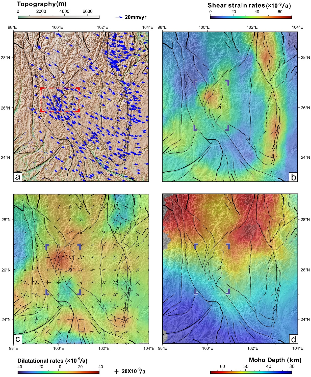 最后,基于前人的地球物理及大地測量資料,本研究重新處理并分析了這個地區內現今的變形特征。表明其現今為高剪切應變率,高面膨脹率的強拉張區,其主拉應力方向接近北東向(圖五),其地殼深部則表現出部分熔融的性質。
