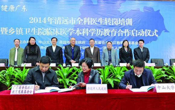 After six-month preparation, the signing ceremony of the project “Healthy Guangdong — Qingyuan General Practitioner Transition Training and Adult Undergraduate Education for Community Clinical Medical Science” was held in Qingyuan People’s Hospital on December 9, 2014. The project is jointly sponsored by Guangdong Hopson Pearl River Education and Development Foundation, Sun Yat-sen University (SYSU) and Qingyuan Municipal People’s Government. Prof. Huang Daren, President of Guangdong Hopson Pearl River Education and Development Foundation; Mr. Ge Changwei, Secretary of the CPC Qingyuan Municipal Committee; Ms. Chen Jianhua, Deputy Mayor of Qingyuan; Prof. Yu Minbin, Vice President of SYSU; Prof. Xiao Haipeng, Party Secretary of The First Affiliated Hospital of SYSU; and Prof. Li Guanhong, Deputy Dean of Zhongshan School of Medicine of SYSU, attended the ceremony with 150 students and teachers.