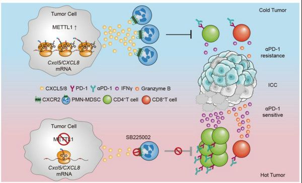 Accumulating studies have revealed that a large population of myeloid-derived suppressor cells (MDSCs) are infiltrated in tumor immune microenvironment (TIME), which have a close link to the clinical efficacy of ICIs therapy and rapid tumor progression. Based on the liver cancer database in the First Affiliated Hospital, Sun Yat-sen University, Prof. Kuang Ming’s team found that Polymorphonuclear myeloid-derived suppressor cells (PMN-MDSCs) are enriched in advanced ICCs and significantly correlated with N7-methylguanosine (m7G) tRNA methyltransferase METTL1. METTL1 regulated the accumulation of PMN-MDSC in TIME and ICC progression. Mechanistically, CXCL8 in human and Cxcl5 in mouse are key translational targets of METTL1 that facilitate its function in promoting PMN-MDSC accumulation in TIME and ICC progression in vivo. Co-blockade of METTL1 and its downstream chemokine pathway enhances the anti-PD-1 efficacy in ICC pre-clinical mouse models.