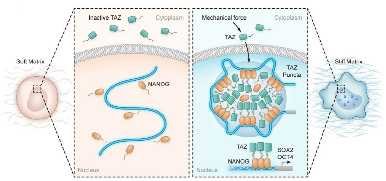 The mechanotransducer TAZ was activated and transported into nucleus by niche mechanical forces. TAZ enhances CSC properties via phase separation with NANOG. TAZ-NANOG phase separation, which is dependent on acidic residues in the N-terminal activation domain of NANOG, promotes the transcription of SOX2 and OCT4.