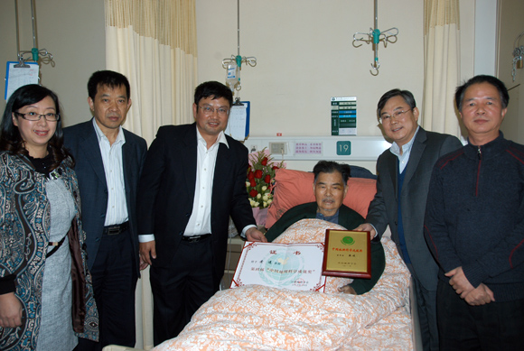 On the afternoon of November 30, Zhang Guoyou, Secretary-General of the Geographical Society of China (GSC), came to Sun Yat-sen Memorial Hospital (South Division) to visit Prof. Huang Jin and wished him good health. Secretary-General Zhang Guoyou presented the “Chinese Geography Achievement Award” to Prof. Huang Jin on behalf of GSC. Bao Jigang, Assistant President of SYSU, Zhang Yuanxun, Secretary of School of Geography and Planning, Liu Zufa, Vice Dean of School of Geography and Planning, and You Yan, Assistant Dean of School of Geography and Planning, also attended the visit.