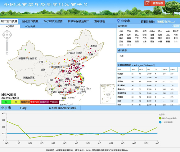 The real-time air quality reporting system Version 1.0 came into use for the first time on January 1st, 2013. It has stable operation over the past one year. It has successfully observed the haze weather in China, such as 5 times strong haze in Beijing-Tianjin-Hebei region in January 2013, the continued large-scale fog haze weather in the Eastern region from January to February, large area of dust-haze pollution involved 104 cities across the country in December and so on. It has played an important role in preventing the air pollution as well as protecting the public’s health.