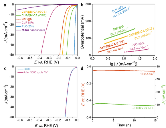 Figure 3. HER performances of the composite catalyst. a) LSV curves of CoP@M-CA and relevant materials. b) Tafel plots of CoP@M-CA and relevant materials. c) LSV curves of CoP@M-CA after 3000 cyclic voltammetry scans. d) chronoamperometry and chronopotentiometry curves. All electrochemical measurements were carried out in 0.5 M H2SO4.