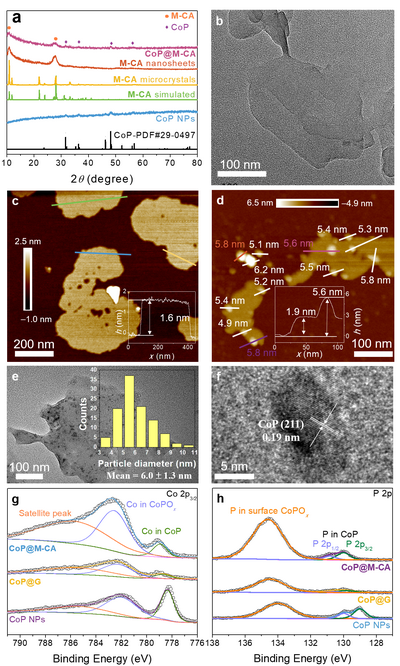 Figure 2. Structural characterization of the nanosheets and catalysts. a) PXRD patterns of the as-synthesized samples of M-CA microcrystals, M-CA nanosheets, CoP NPs, and CoP@M-CA. b) TEM image of M-CA nanosheets. c) AFM image of M-CA nanosheets (inset: corresponding height profile along the green line). d) AFM image of CoP@M-CA (inset: corresponding height profile along the pink line). e) TEM image of CoP@M-CA (inset: particle size distribution of CoP NPs). f) HRTEM image of a typical CoP nanoparticle in CoP@M-CA. High resolution XPS spectra of g) Co 2p3/2 and h) P 2p for CoP NPs, CoP@G and CoP@M-CA.