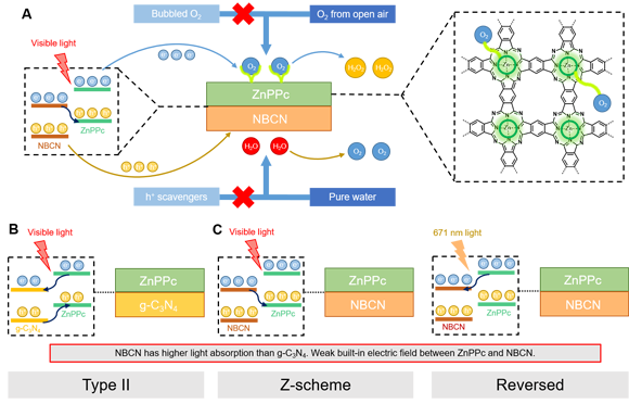 Figure. (A) Pathways for the photosynthesis of H2O2 from H2O and O2. (B) Electron transfer in ZnPPc-g-C3N4 under visible light illumination. (C) Electron transfer in ZnPPc-NBCN under visible light or monochromatic light illumination.