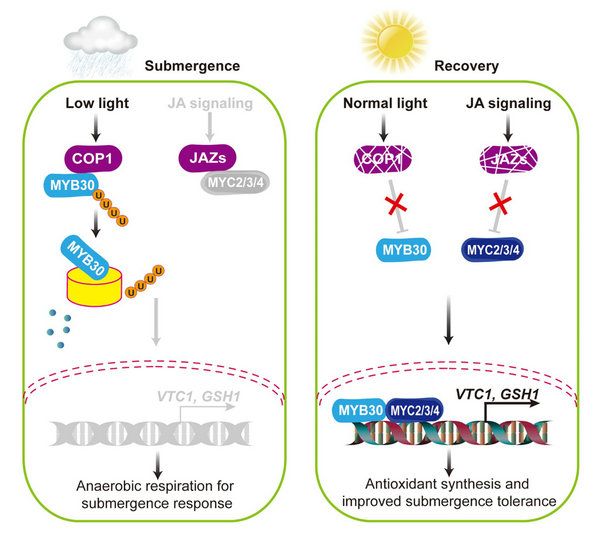 At present, the frequency of flood disasters has increased sharply around the world, and the scope of disasters has expanded year by year, and it has become one of the most important agricultural disasters. Prolonged plant immersion in flood/flooded environments can lead to a significant decrease in rhizosphere oxygen content, resulting in hypoxic stress (hypoxia); Long-term flooding stress will also greatly reduce the light intensity of the plant environment, resulting in weak light stress. Therefore, low oxygen and weak light are the two key factors affecting the flooding adaptability of plants. Studies have shown that in the reoxygenation response of plants after flooding, light changes are an important reason for the accumulation of peroxides in cells and affecting the stress tolerance of plants. However, so far, the mechanism of how light regulates plant flooding and post-flooding reoxygenation response is unclear.