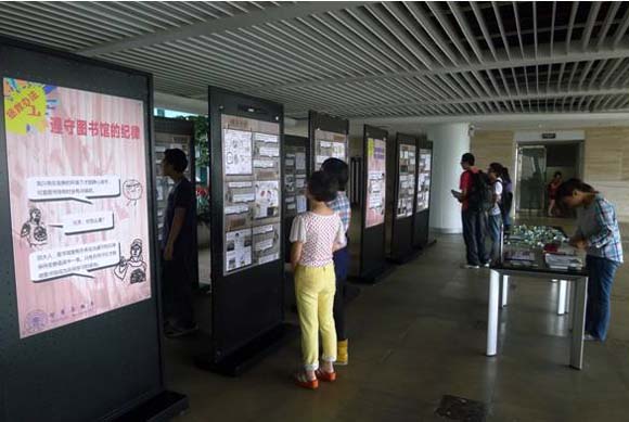 The exhibition displays such potential inappropriate behaviors as over-due borrowing and inappropriate self-helping that might occur among students in their daily contact with the library. Consequences brought by these behaviors are made into interesting comic strips where Di Renjie and Yuan Fang, the two internet celebrities present the proper ways of borrowing and self-helping through their witty dialogues. It is aimed at providing reader education and promoting library culture in a light and funny way.