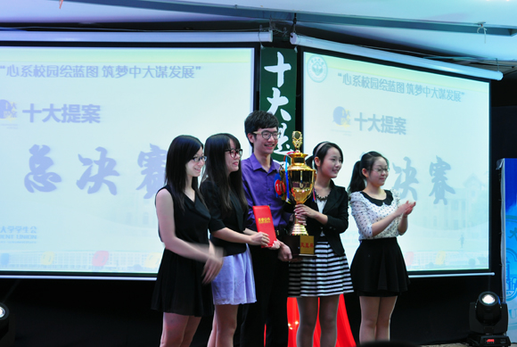 After a three-hour fierce competition, “On Solving the Problem of Slippery Floor Tiles in the Teaching Building on Zhuhai Campus”, the proposal made by Xiao Jingxuan, Zhou Xiang, Lai Xiaoli and Geng Hui, eventually won the Phoenix Cup in the final contest of 2013 “Ten Proposals” collection on four campuses.