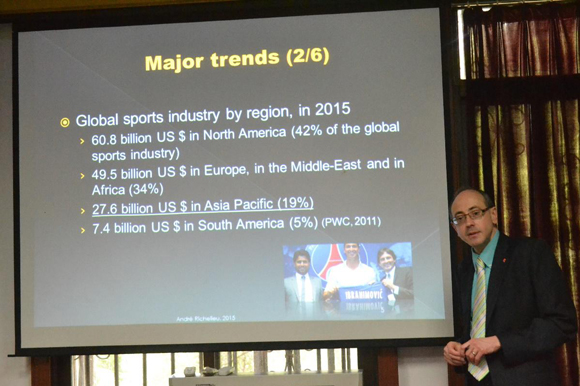 Professor Richelieu started the lecture with the sense of belonging and self-identification as a soccer fan. Then he made a detailed introduction about the main trends of the developments of sports tourism with detailed examples. The main trends include the regional development of sports industry the relationship between organization of sports and GDP growth, the globalization of sports, the wealth effect of sports business and the rise of sport entertainment. Professor Richelieu shared the leverage effects, opportunity & challenge in relation to the organization of sport events.