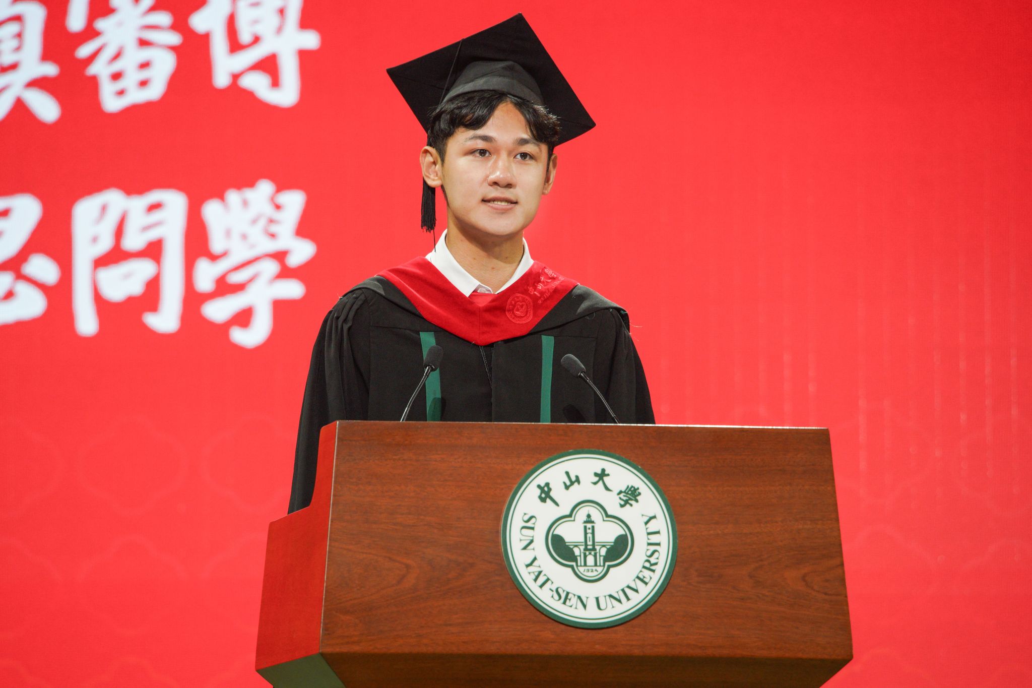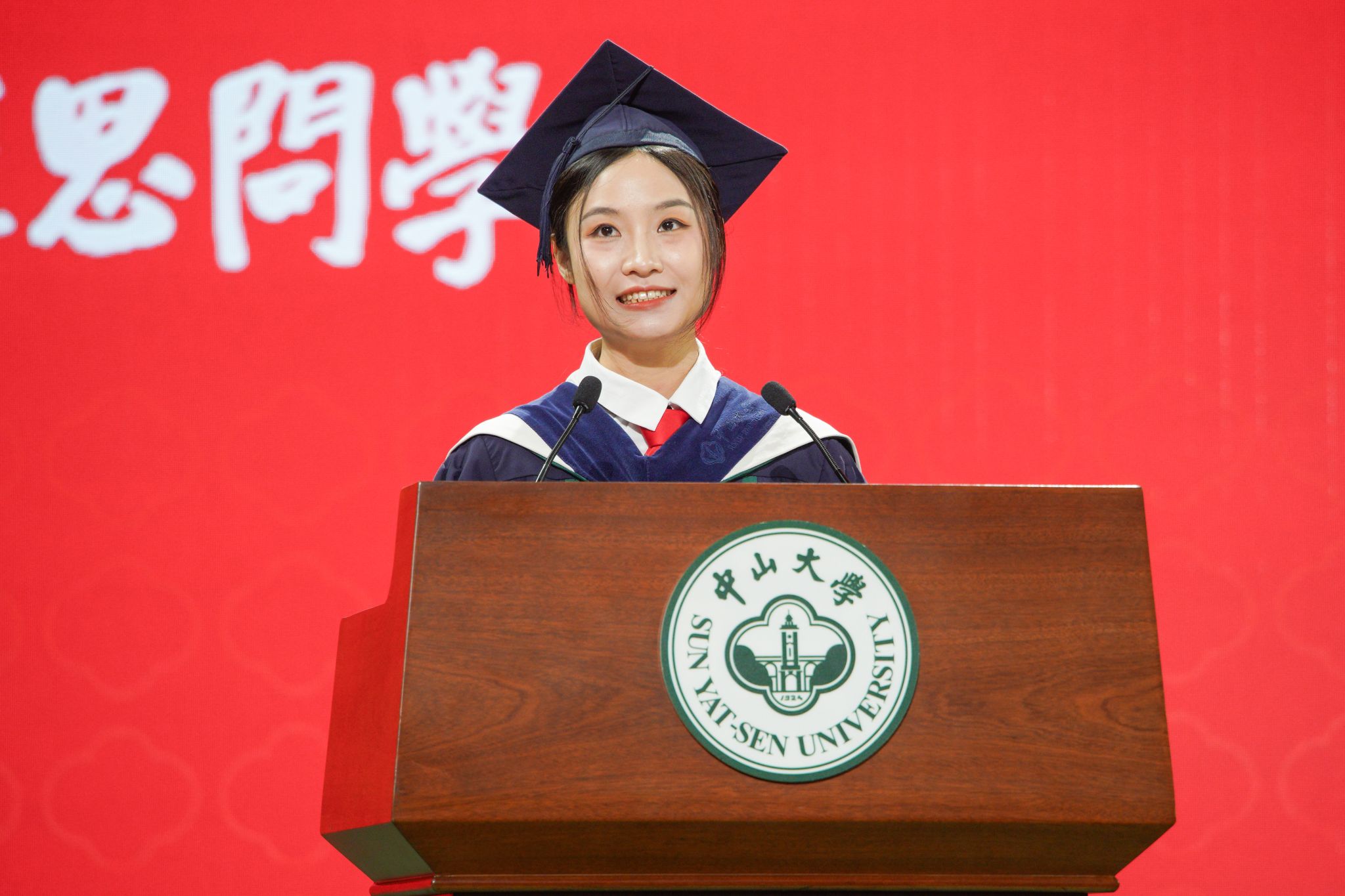 Wang Zijie, a representative of undergraduates from the School of Agriculture and Biotechnology at SYSU, speaks at the graduation ceremony for the class of 2024 on June 22.