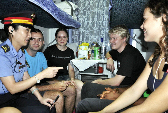The chief attendant talking with international students in Chinese