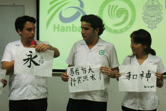 Mexican students showing their Chinese calligraphy works at the closing ceremony
