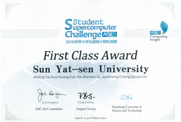 On April 22nd, 2016, Team SYSU won the First Class Award of the 2016 ASC Student Supercomputer Challenge (ASC16), the largest supercomputer contest in the world, and got the Application Innovation Award for the first time. During the competition of six applications’ optimization, Team SYSU ranked first on accelerating the de novo paired-end sequence assembling with ABySS, and second on optimizing the computation on materials science with ABINIT.