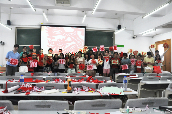 Students and their work from the class of Chinese Paper Cutting in the 2015 SYSU International Summer Program