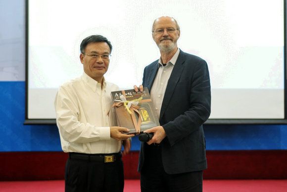 On behalf of Sun Yat-sen University, Vice President Yan Guangmei (left) presents a souvenir to Professor Robert H. Grubbs (right).