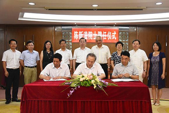 President Luo Jun (middle) and Dean Huang Min (left) signing the appointment contract with Academician Albert S. C. Chan (right)