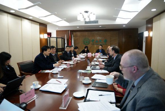 On December 10-11, 2014, an 8-member delegation led by Dr. Charles Bantz, Chancellor of IUPUI and Executive Vice President of Indiana University (IU), visited SYSU. Members of the IU/IUPUI delegation also included Dr. Zebulun Davenport, Vice-Chancellor for Student Affairs, IUPUI; Dr. Gil Latz, Associate Vice Chancellor for International Affairs, IUPUI; Dr. David James Russomanno, Dean of Purdue School of Engineering and Technology, IUPUI; Dr. Mary Beth Riner, Associate Dean for Global Affairs of School of Nursing, IU; Dr. Thomas Davis, Associate Dean for Academic Programs of IU School of Liberal Arts at IUPUI; Dr. Joe Xu, Director of Confucius Institute in Indianapolis; and Mr. Steven Yin, Manager of the new IU China Gateway Office in Beijing.