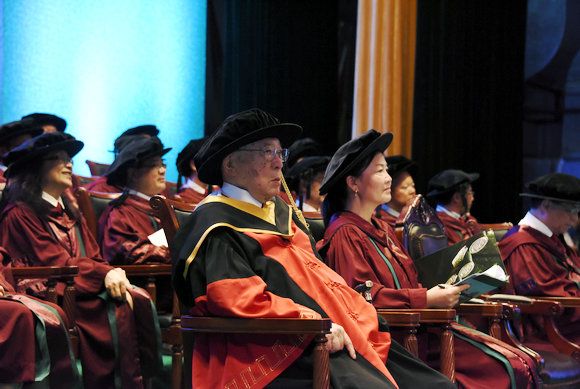 At the invitation of President Luo Jun, Dr. James T. Wu, in his nineties, attended the SYSU Commencement 2015. Dr. James T. Wu is the Honorary Chairman of the SYSU Advisory Board, the Recipient of the Honorary Doctor’s Degree from SYSU, the Honorary Chairman of the Board of Trustees of Lingnan (University) College, and the Honorary Chairman of Maxim's Group.