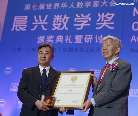 Zhu Xiping (L), a professor at the School of Mathematics in Sun Yat-sen University, receives the Chern Medal award at the opening ceremony of the 7th International Congress of Chinese Mathematicians (ICCM) in Beijing, capital of China, Aug. 6, 2016. The Chern Medal, an international award recognizing outstanding lifelong achievement of the highest level in the field of mathematics, is named in honor of late Chinese mathematician Shiing-Shen Chern (Chen Xingshen). The congress is a triennial event that brings together Chinese and overseas mathematicians for the discussion of the developments of mathematics. (Xinhua/Cai Yang)