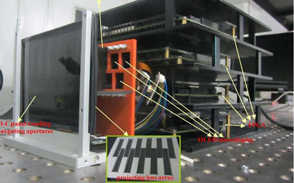 The team's prototype system consists of 11 elementary projecting units. Each projecting unit is constructed by an organic light-emitting diode (OLED) microdisplay, a rectangular projecting lens, two vertical baffles and a group of gating apertures (liquid crystal panel) attached to the projecting lens. By gating different gating apertures in sequence and refreshing the virtual image of the corresponding microdisplay synchronously, the researchers can obtain dense viewpoints on the display screen.