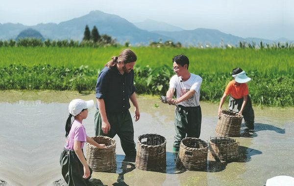 Yang Bing (second from right) catches fish with international tourists during a tourism activity in the terraced fields of Azheke.