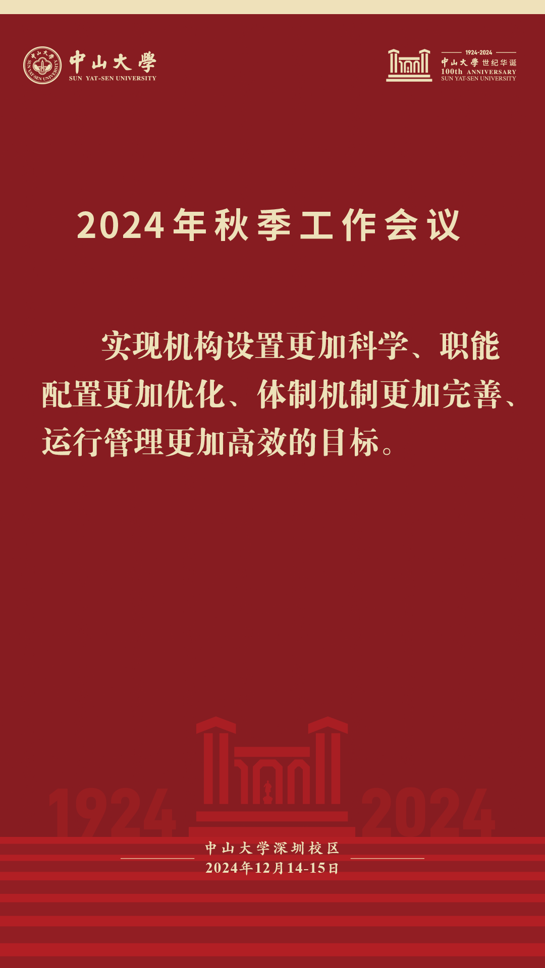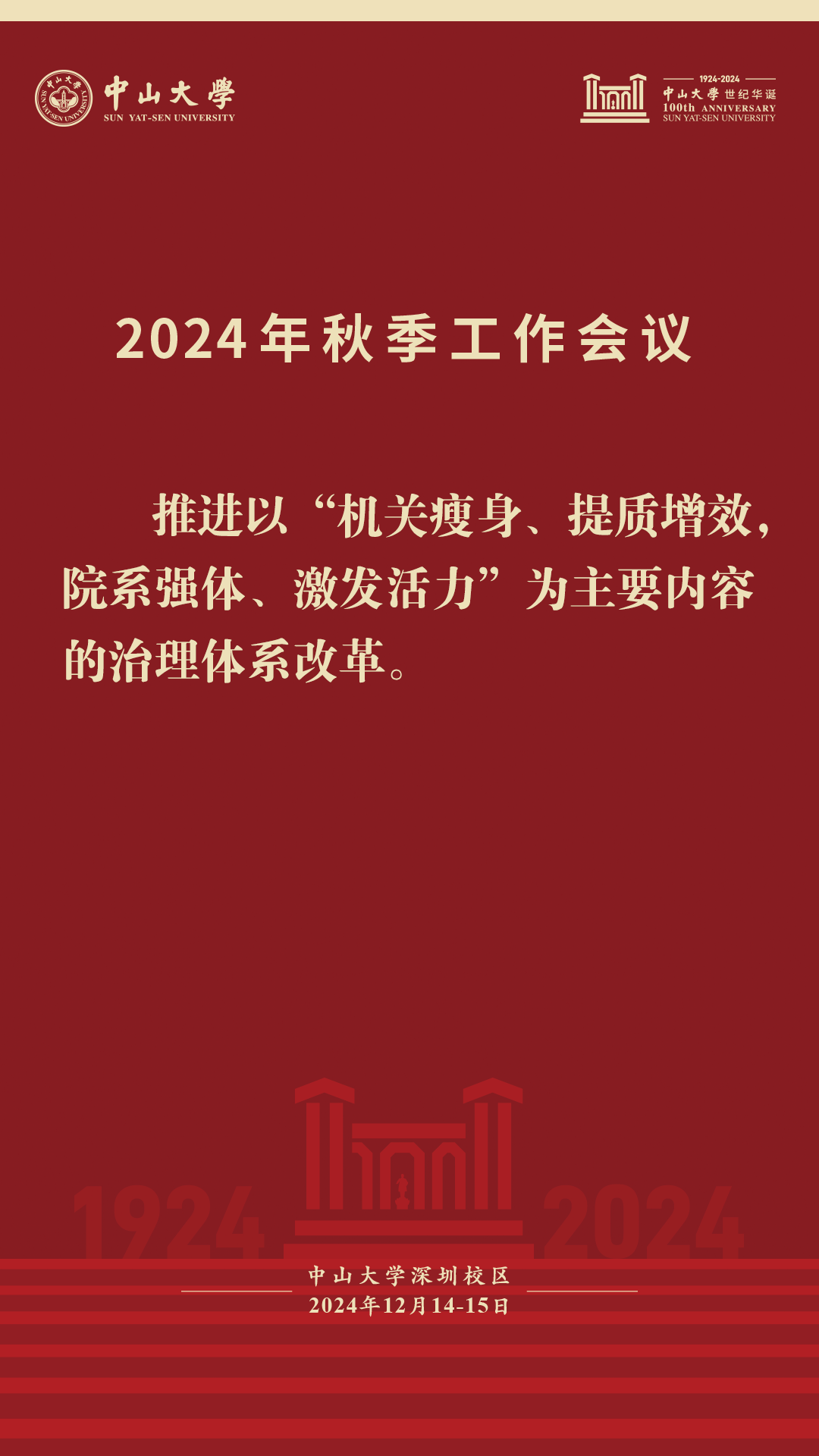 本次秋季工作會議為期兩天。在后續(xù)的議程中,14日下午教務部、研究生院、科學研究院、人力資源管理處負責人進行專題報告,發(fā)展規(guī)劃辦公室、財務處、總務部、政治與公共事務管理學院、數(shù)學學院、中山醫(yī)學院、地球科學與工程學院、先進制造學院負責人代表機關(guān)部處和院系圍繞完善內(nèi)部治理體系進行發(fā)言。14日晚上與會人員按學部分組討論。15日上午,各分組召集人代表將結(jié)合大會報告、分組討論情況在會上發(fā)言。