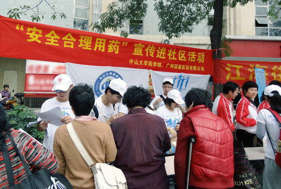 On April 13, the “safe and rational drug use in community” public benefit activity was carried out simultaneously in Liu Fu Plaza and the community on Hailian Road in Haizhu District, Guangzhou. The activity was cosponsored by the CYL Committee of School of Pharmaceutical Sciences of Sun Yat-sen University, Guangzhou Guoying Pharmaceuticals Corporation and Haizhu District Jianghai Street Community Health Service Center, with strong support from the CYL Committee of Haizhu District and the Party Committee of Haizhu District Public Health Bureau.